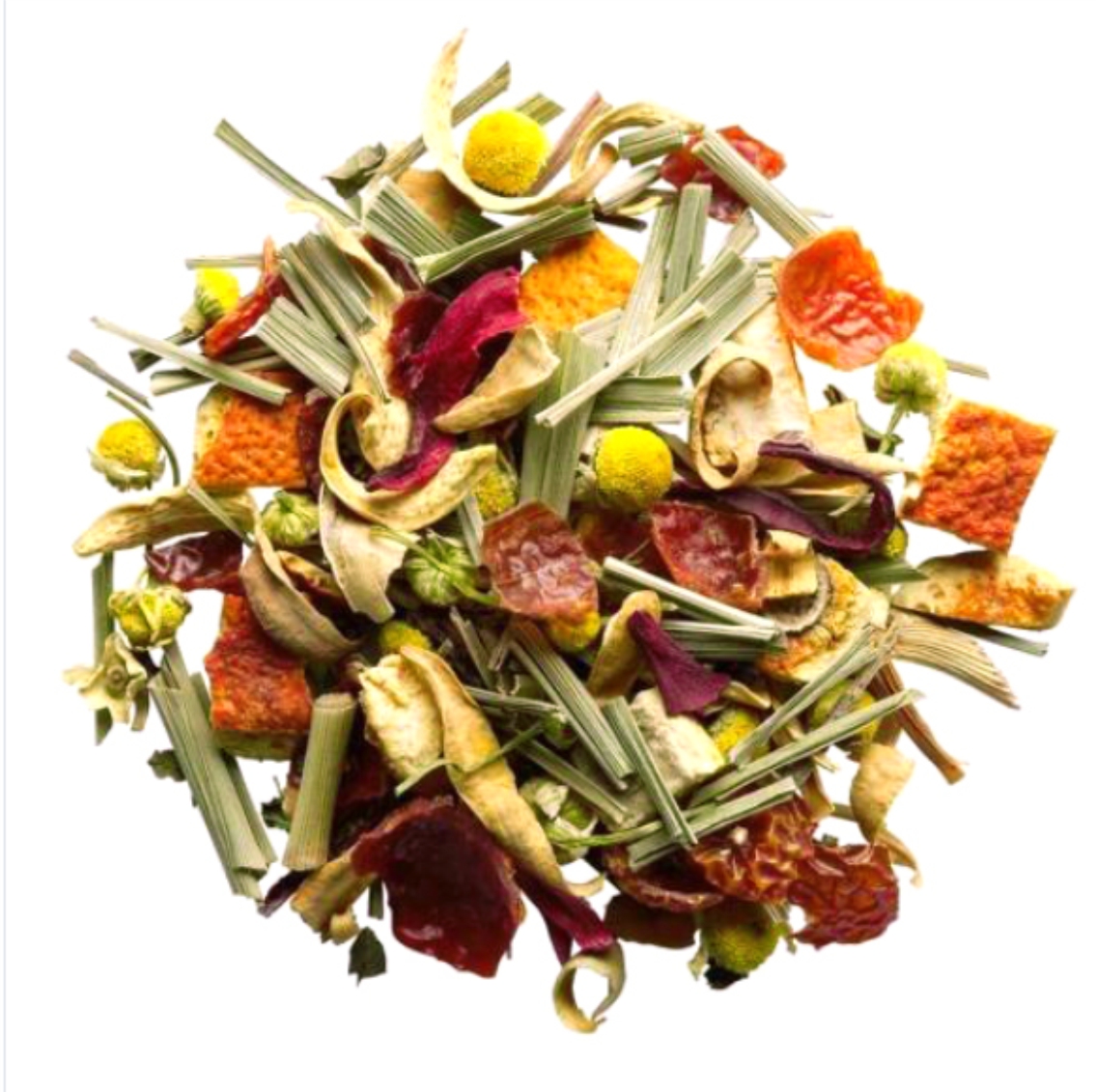 Skład herbaty obejmuje starannie dobrane składniki, takie jak: trawa cytrynowa, kwiaty rumianku, owoce dzikiej róży, skórka pomarańczowa, liście mięty pieprzowej, liście jeżyny, kawałki jabłka, mate, kwiaty pomarańczy, ziele jeżówki oraz płatki kwiatów (krokosz i chaber). Dzięki tej wyjątkowej kompozycji każdy łyk tej herbaty to niepowtarzalna chwila przyjemności.